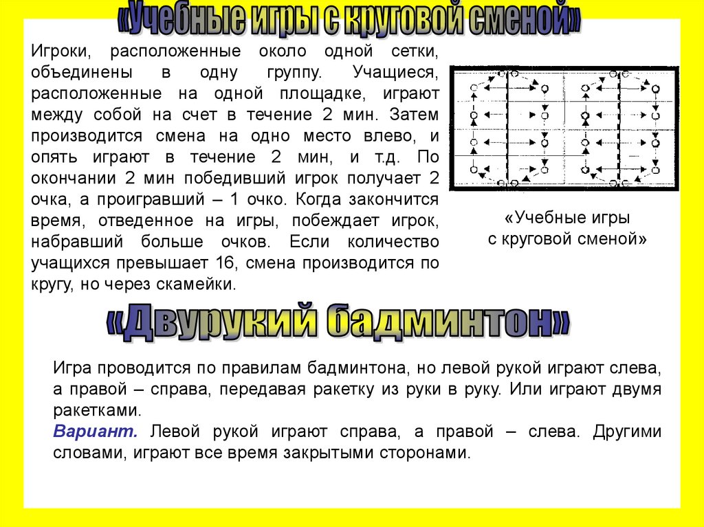 Игра проводится по правилам бадминтона, но левой (слабейшей)