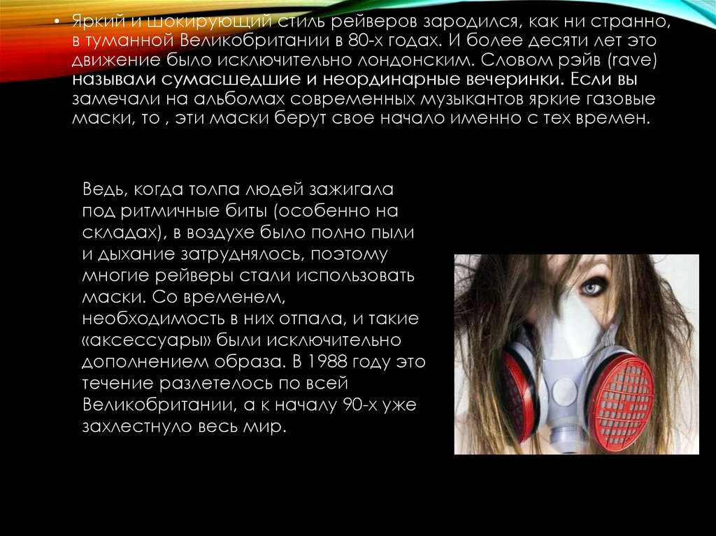 • Яркий и шокирующий стиль рейверов зародился, как ни странно,в туманной Великобритании в 80-х годах. И более десяти лет это