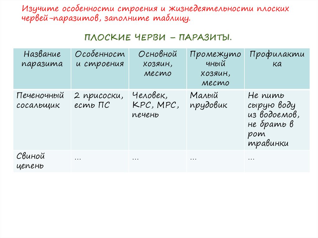 Изучите особенности строения и жизнедеятельности плоскихчервей-паразитов, заполните таблицу.