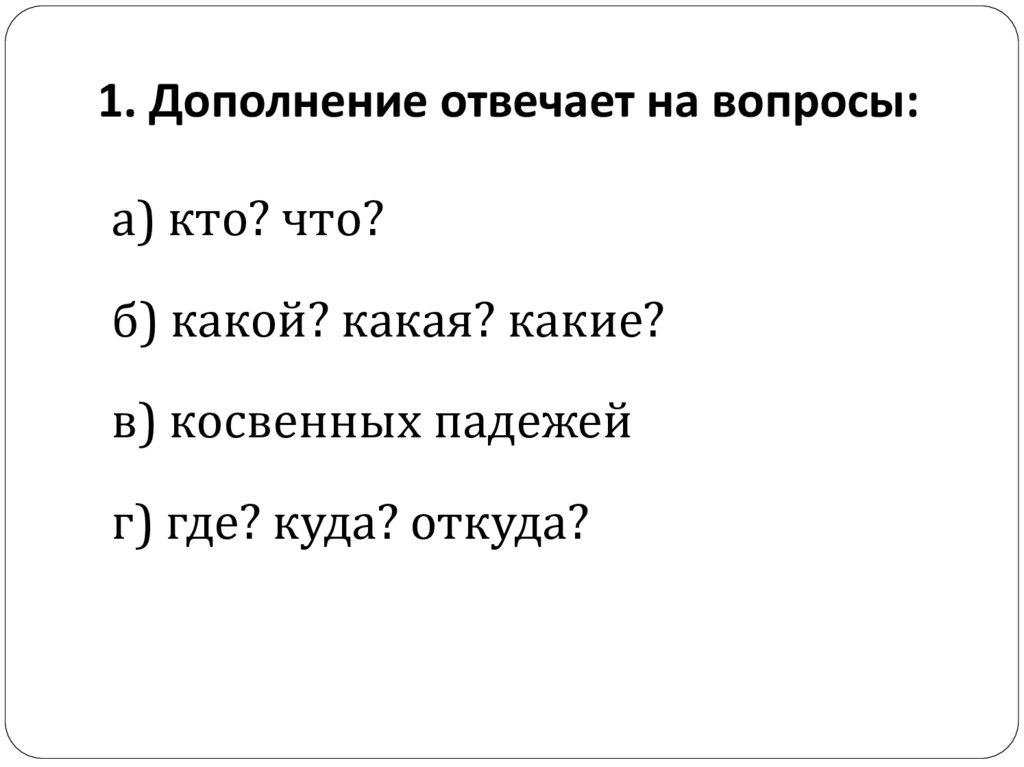 1. Дополнение отвечает на вопросы:а) кто? что?
