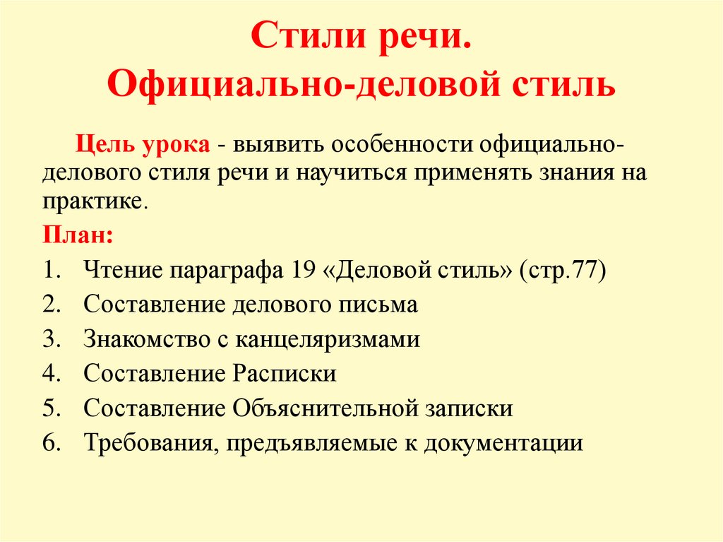Цель урока - выявить особенности официальноделового стиля речи и научиться применять знания на