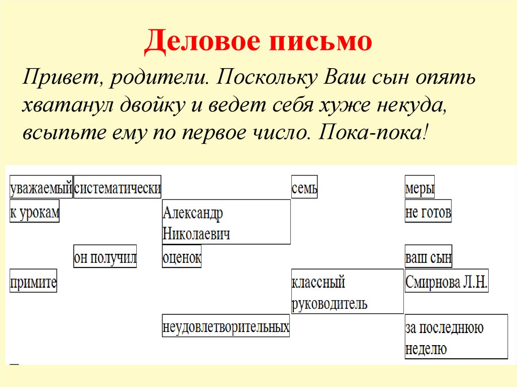 Деловое письмоПривет, родители. Поскольку Ваш сын опять