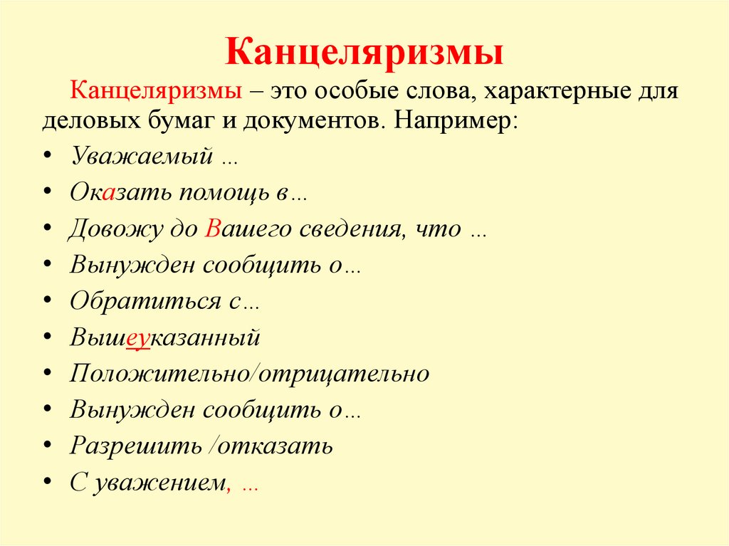 КанцеляризмыКанцеляризмы – это особые слова, характерные для
