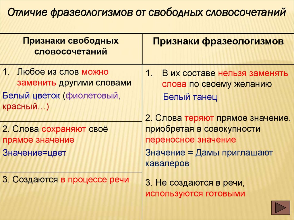 Отличие фразеологизмов от свободных словосочетанийПризнаки свободных