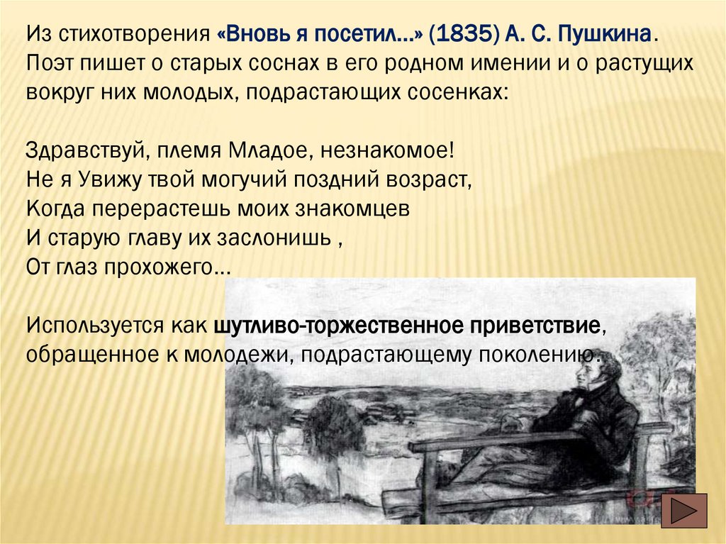 Из стихотворения «Вновь я посетил...» (1835) А. С. Пушкина.Поэт пишет о старых соснах в его родном имении и о растущих