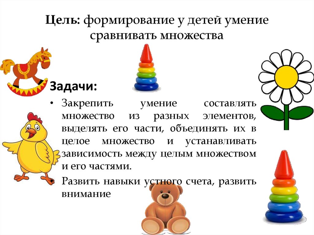 Цель: формирование у детей умениесравнивать множества