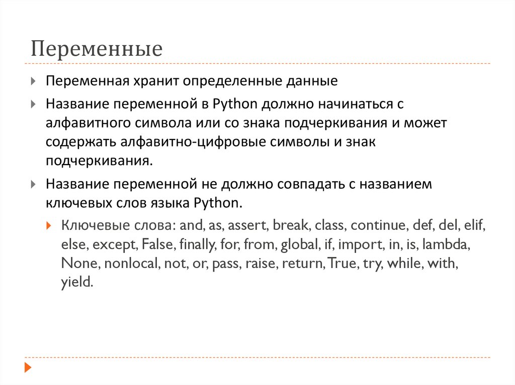 Ключевые слова: and, as, assert, break, class, continue, def, del, elif,