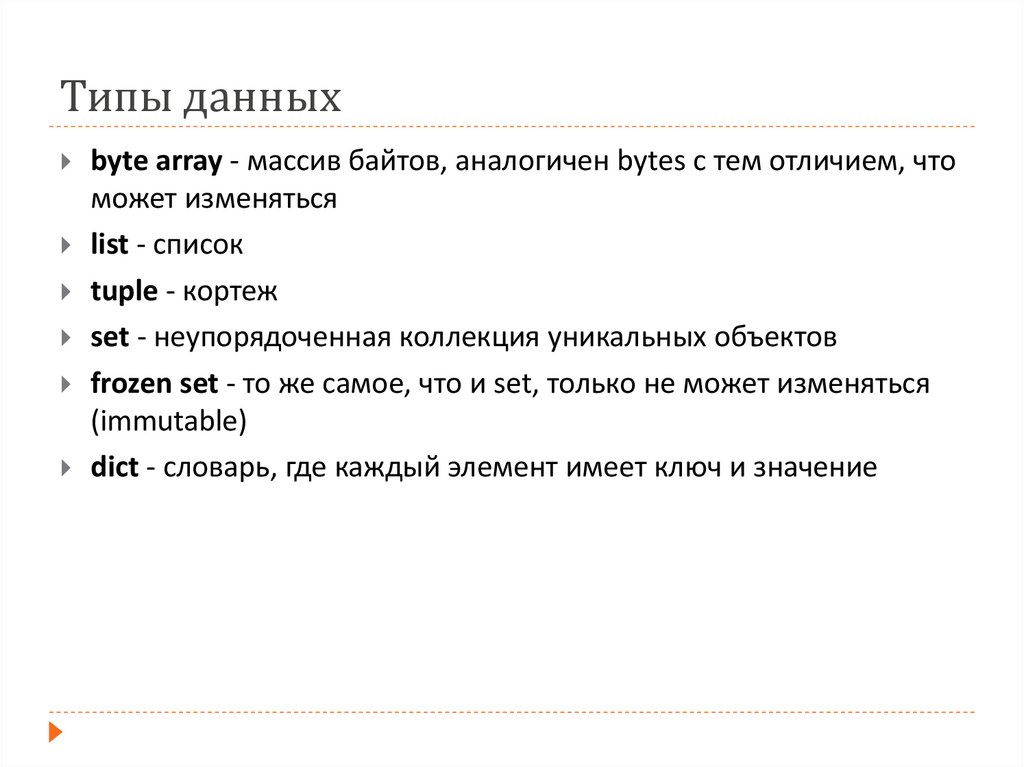 Типы данныхbyte array - массив байтов, аналогичен bytes с тем отличием, что