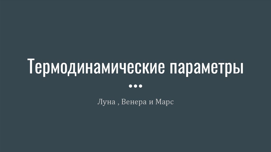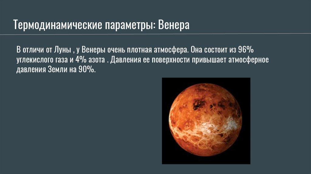 Термодинамические параметры: ВенераВ отличи от Луны , у Венеры очень плотная атмосфера. Она состоит из 96%