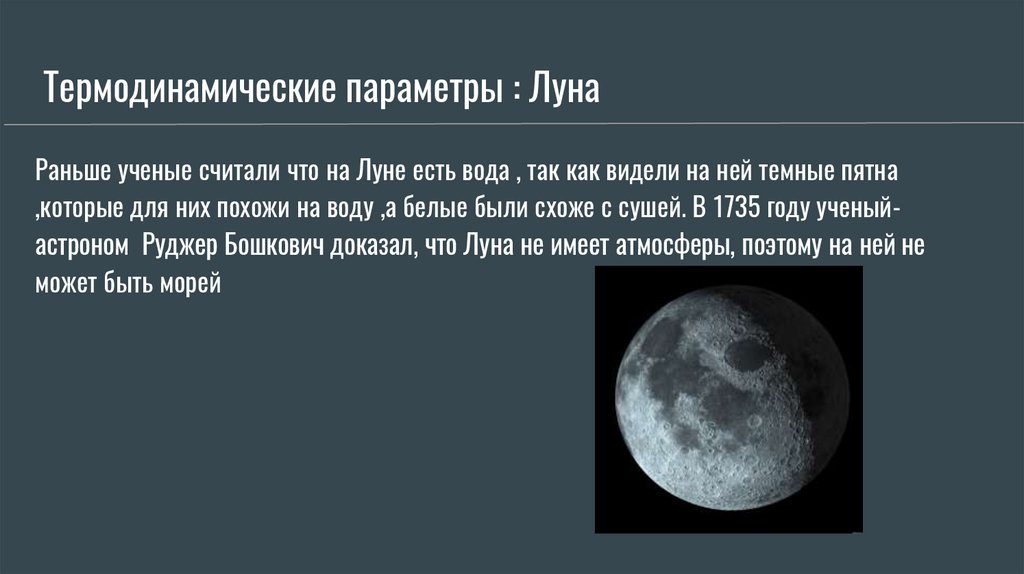 Термодинамические параметры : ЛунаРаньше ученые считали что на Луне есть вода , так как видели на ней темные пятна