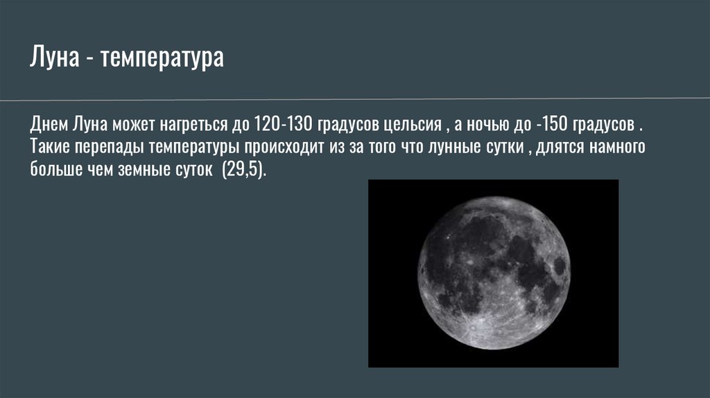 Луна - температураДнем Луна может нагреться до 120-130 градусов цельсия , а ночью до -150 градусов .