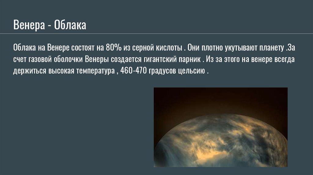 Венера - ОблакаОблака на Венере состоят на 80% из серной кислоты . Они плотно укутывают планету .За