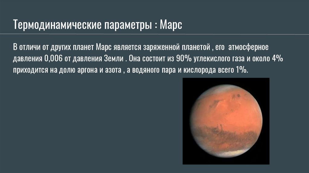 Термодинамические параметры : МарсВ отличи от других планет Марс является заряженной планетой , его атмосферное