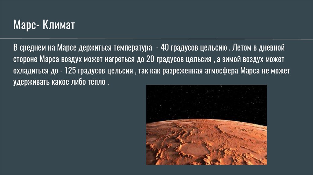 Марс- КлиматВ среднем на Марсе держиться температура - 40 градусов цельсию . Летом в дневной