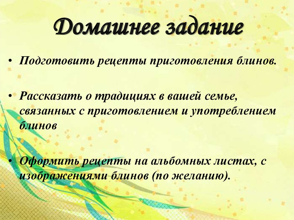 • Подготовить рецепты приготовления блинов.