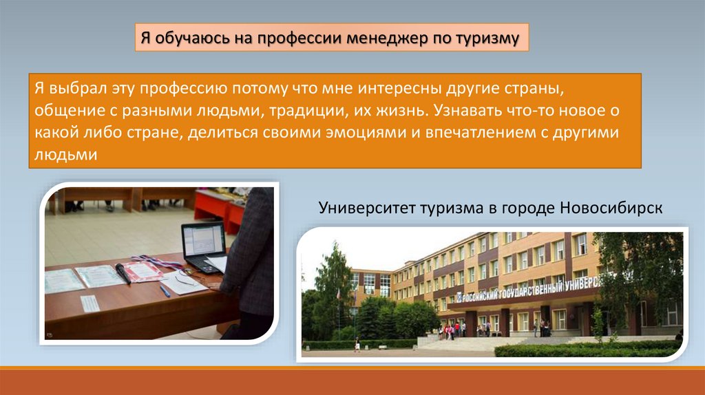 Я обучаюсь на профессии менеджер по туризмуЯ выбрал эту профессию потому что мне интересны другие страны,