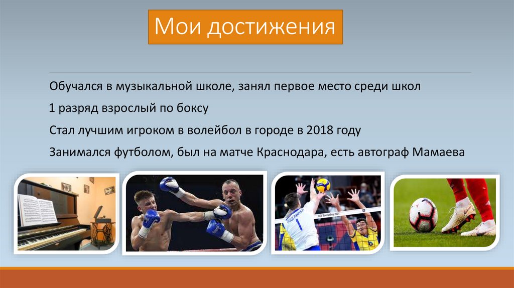 Мои достиженияОбучался в музыкальной школе, занял первое место среди школ