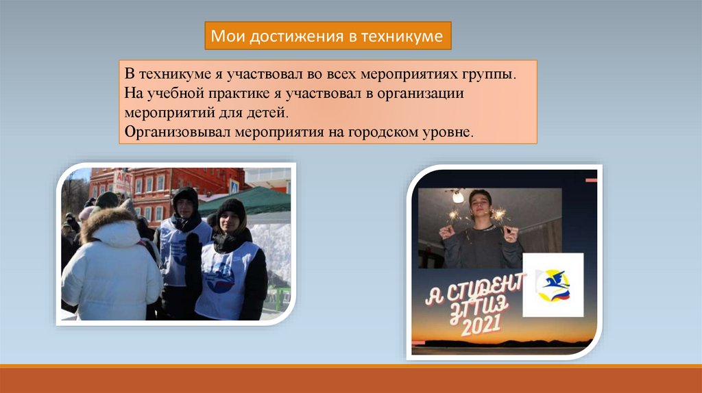 Мои достижения в техникумеВ техникуме я участвовал во всех мероприятиях группы.