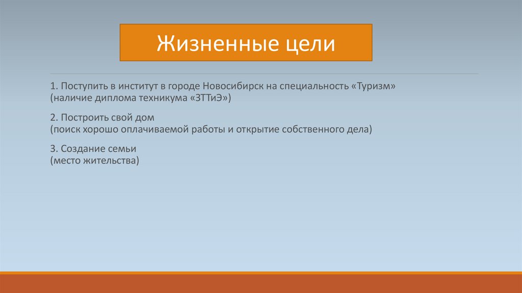 Жизненные цели1. Поступить в институт в городе Новосибирск на специальность «Туризм»