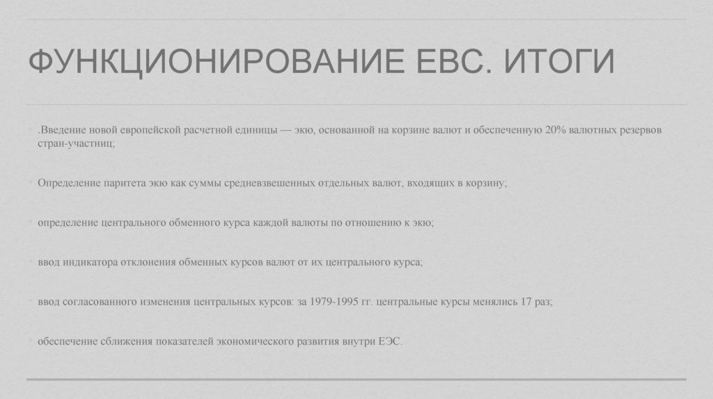 ФУНКЦИОНИРОВАНИЕ ЕВС. ИТОГИ• .Введение новой европейской расчетной единицы — экю, основанной на корзине валют и обеспеченную 20% валютных резервов