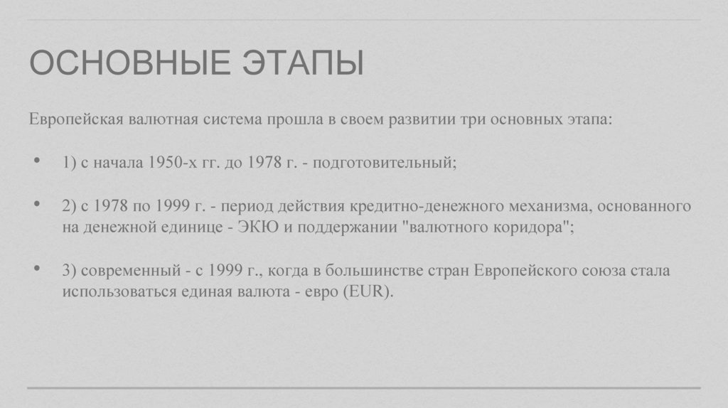 ОСНОВНЫЕ ЭТАПЫЕвропейская валютная система прошла в своем развитии три основных этапа: