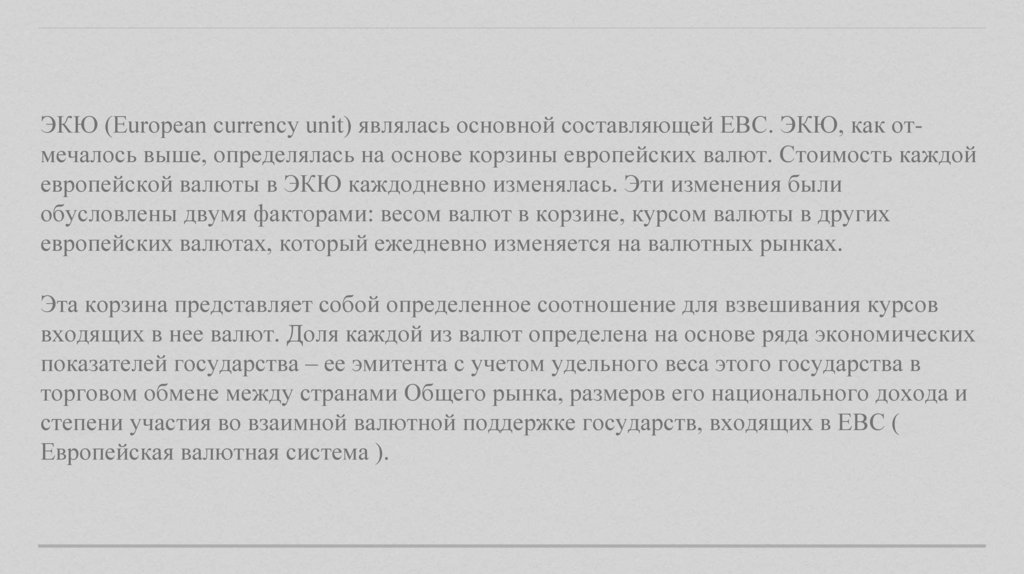 ЭКЮ (European currency unit) являлась основной составляющей ЕВС. ЭКЮ, как отмечалось выше, определялась на основе корзины европейских валют. Стоимость каждойевропейской валюты в ЭКЮ каждодневно изменялась. Эти изменения были