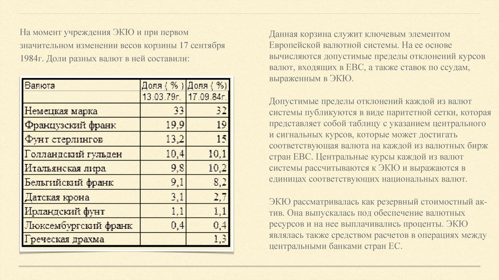 На момент учреждения ЭКЮ и при первомзначительном изменении весов корзины 17 сентября