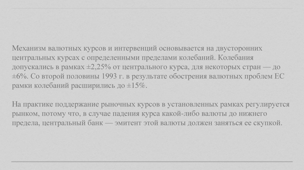 Механизм валютных курсов и интервенций основывается на двустороннихцентральных курсах с определенными пределами колебаний. Колебания