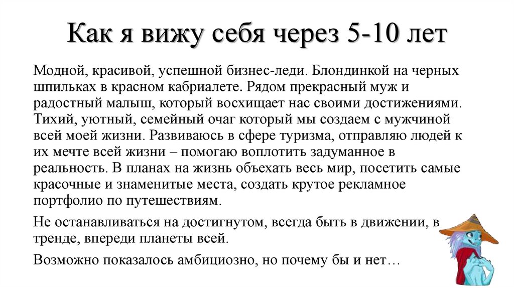 Как я вижу себя через 5-10 летМодной, красивой, успешной бизнес-леди. Блондинкой на черных