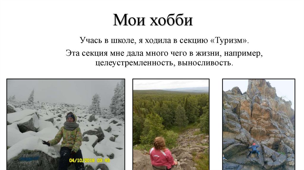 Мои хоббиУчась в школе, я ходила в секцию «Туризм».
