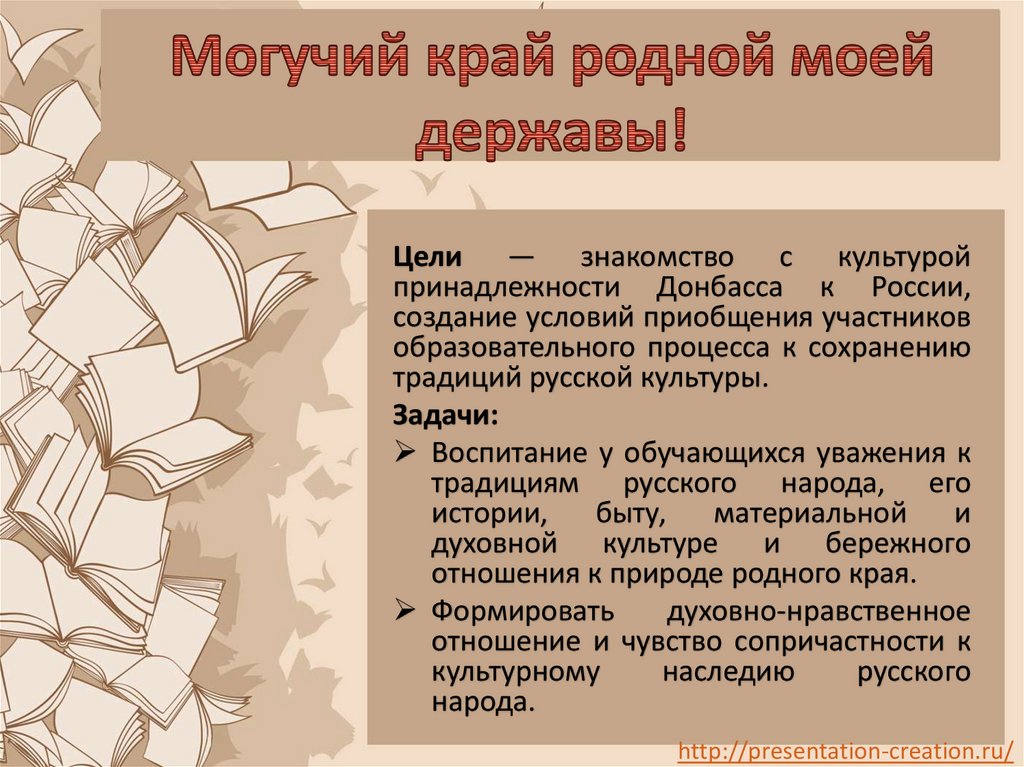 Цели — знакомство с культуройпринадлежности Донбасса к России,