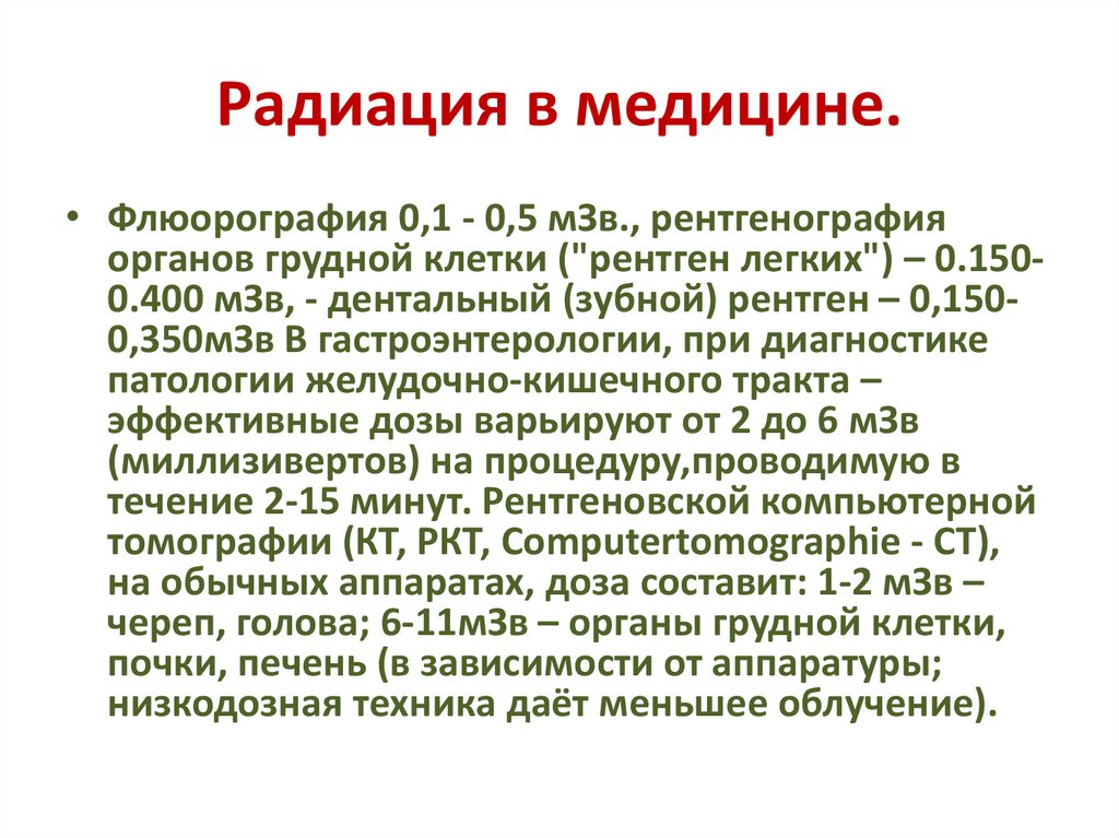 Радиация в медицине.• Флюорография 0,1 - 0,5 мЗв., рентгенография