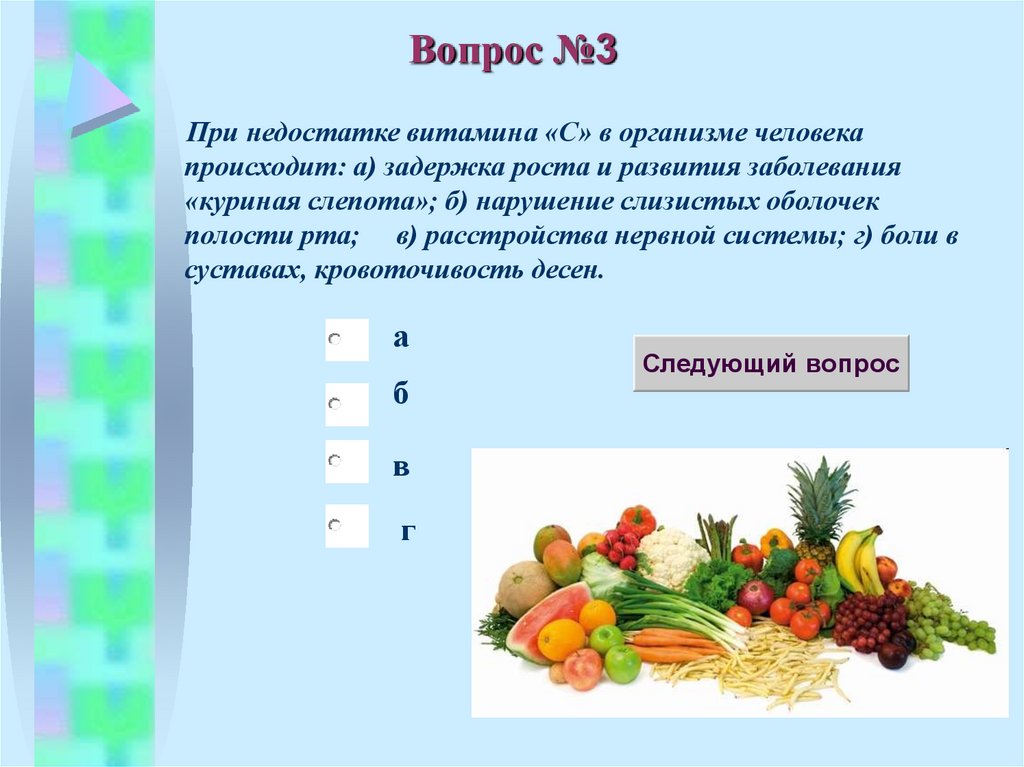 Вопрос №3При недостатке витамина «С» в организме человека