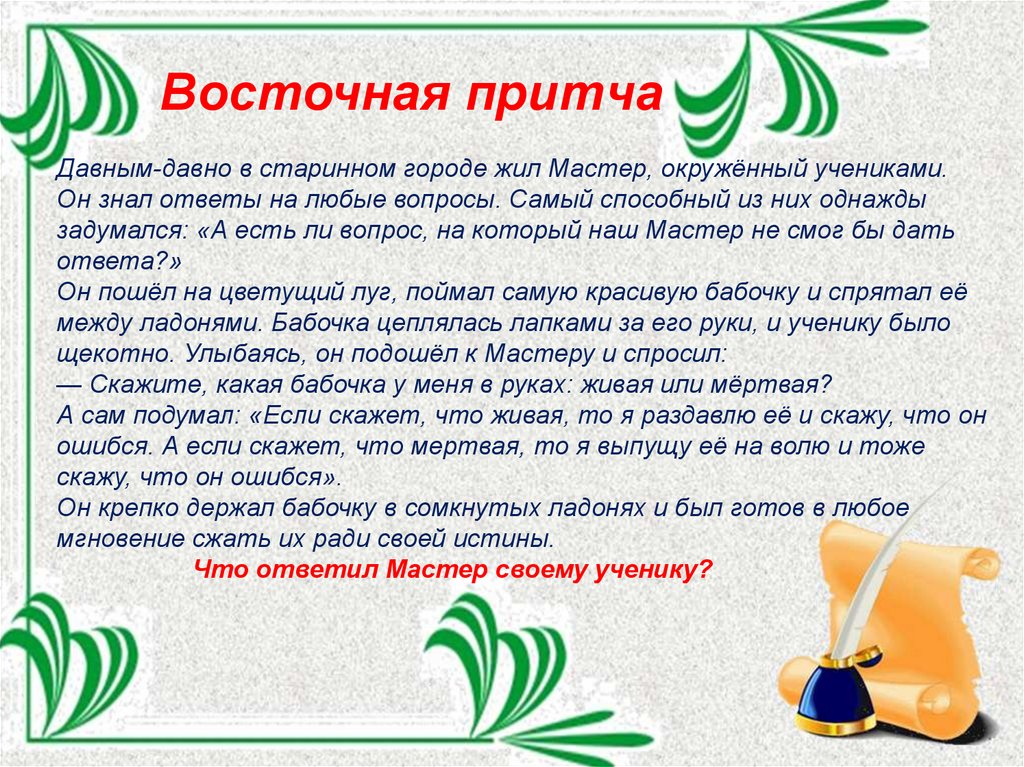 Восточная притчаДавным-давно в старинном городе жил Мастер, окружённый учениками.