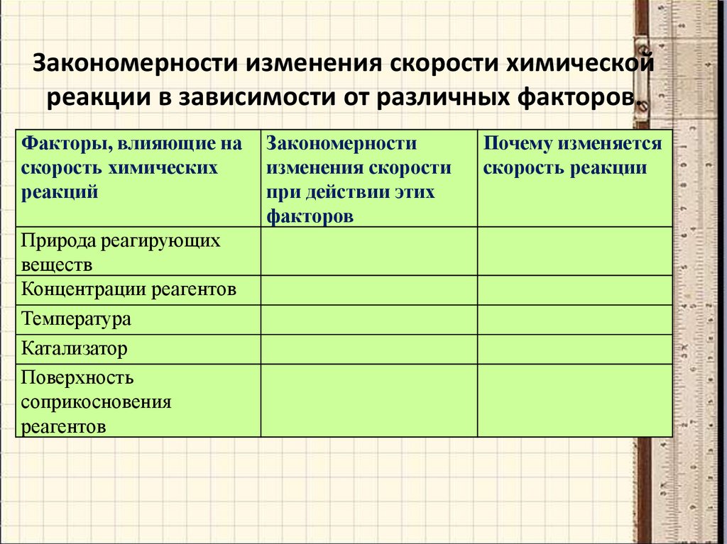 Закономерности изменения скорости химическойреакции в зависимости от различных факторов.
