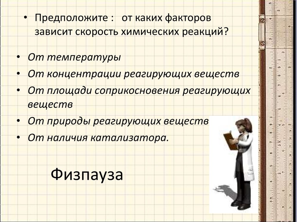 • Предположите : от каких факторовзависит скорость химических реакций?