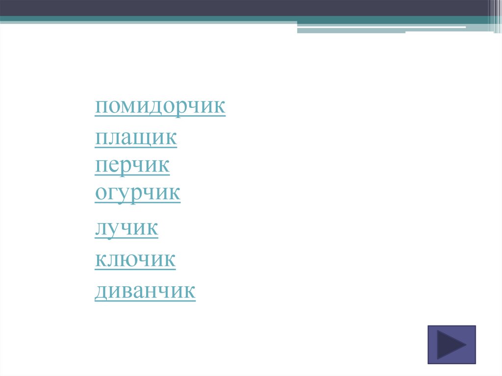 пер..ик, огур..ик, лу..ик, клю..ик,