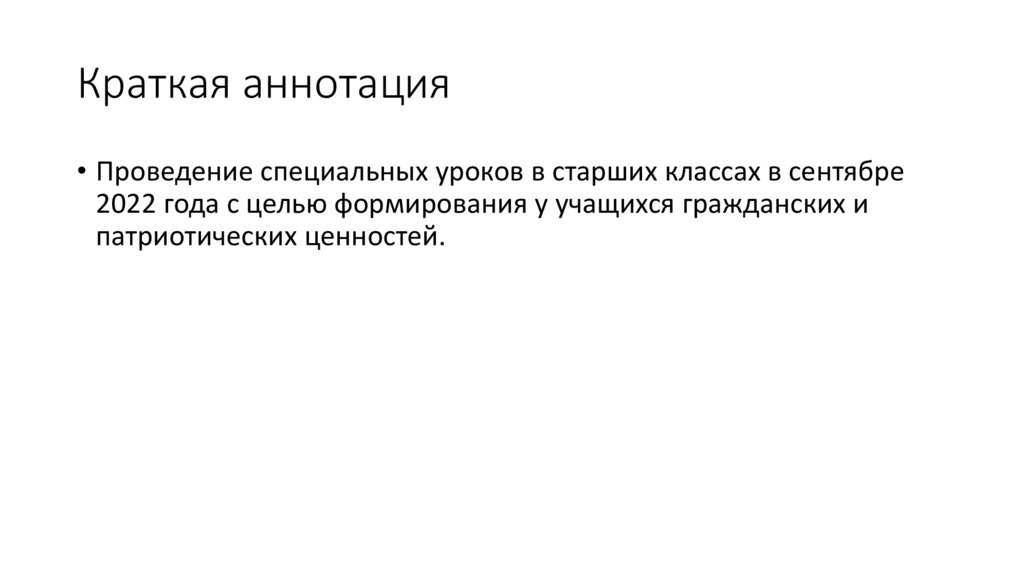 Краткая аннотация• Проведение специальных уроков в старших классах в сентябре