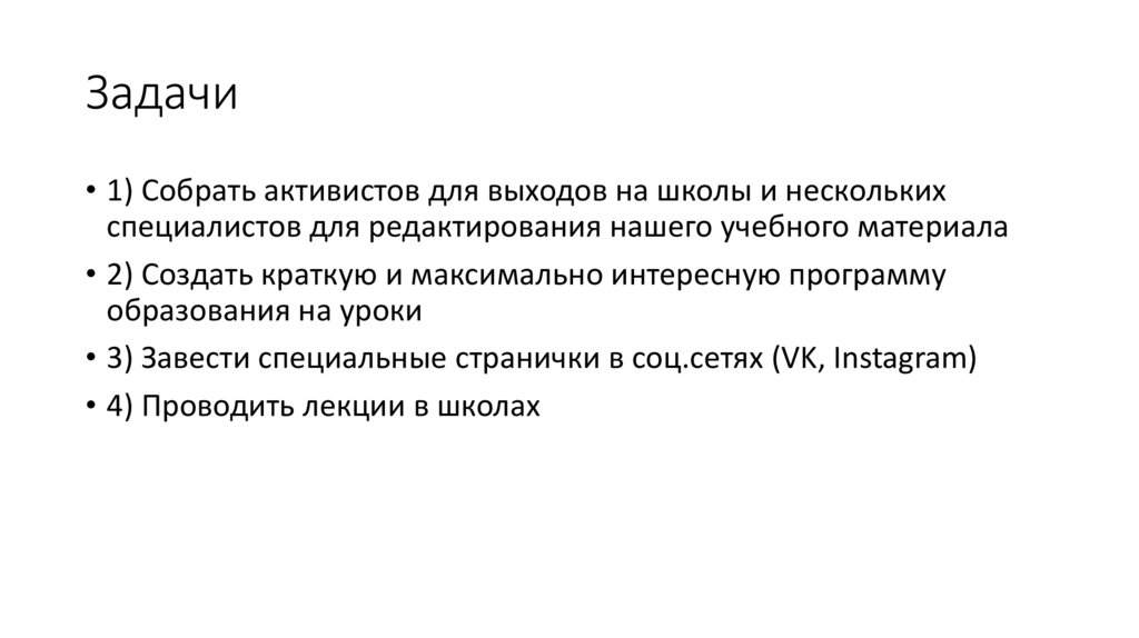 Задачи• 1) Собрать активистов для выходов на школы и нескольких