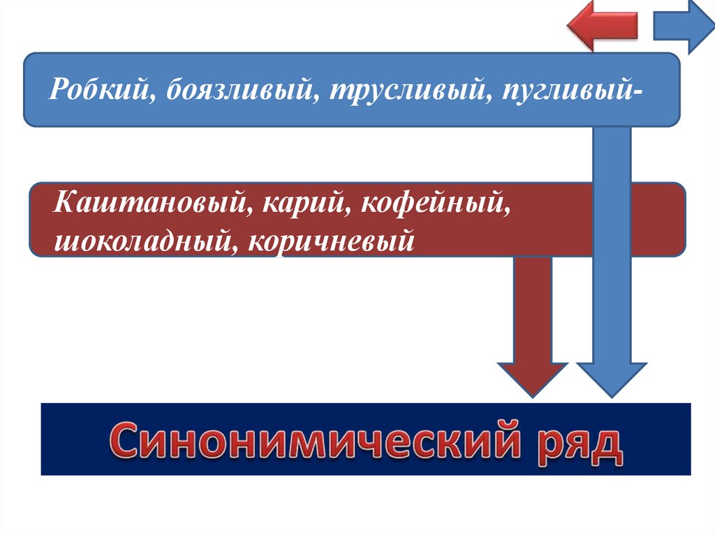 Робкий, боязливый, трусливый, пугливыйКаштановый, карий, кофейный,шоколадный, коричневый