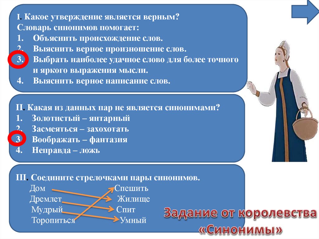 I. Какое утверждение является верным?Словарь синонимов помогает: