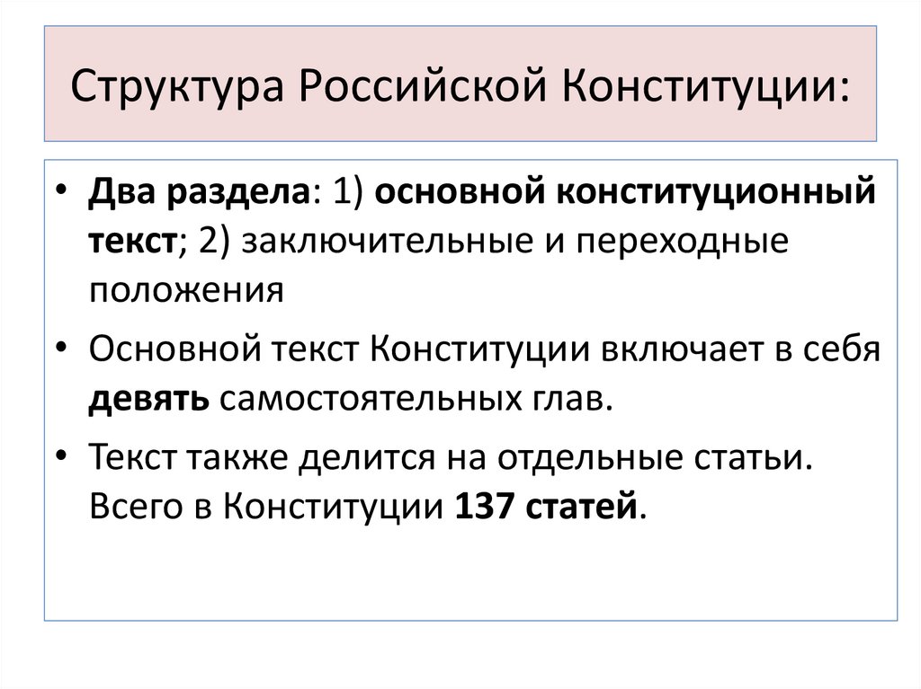 Структура Российской Конституции:• Два раздела: 1) основной конституционный