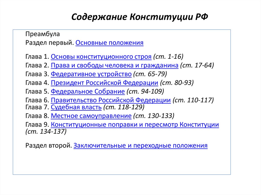 • Основной текст Конституции включает в себя