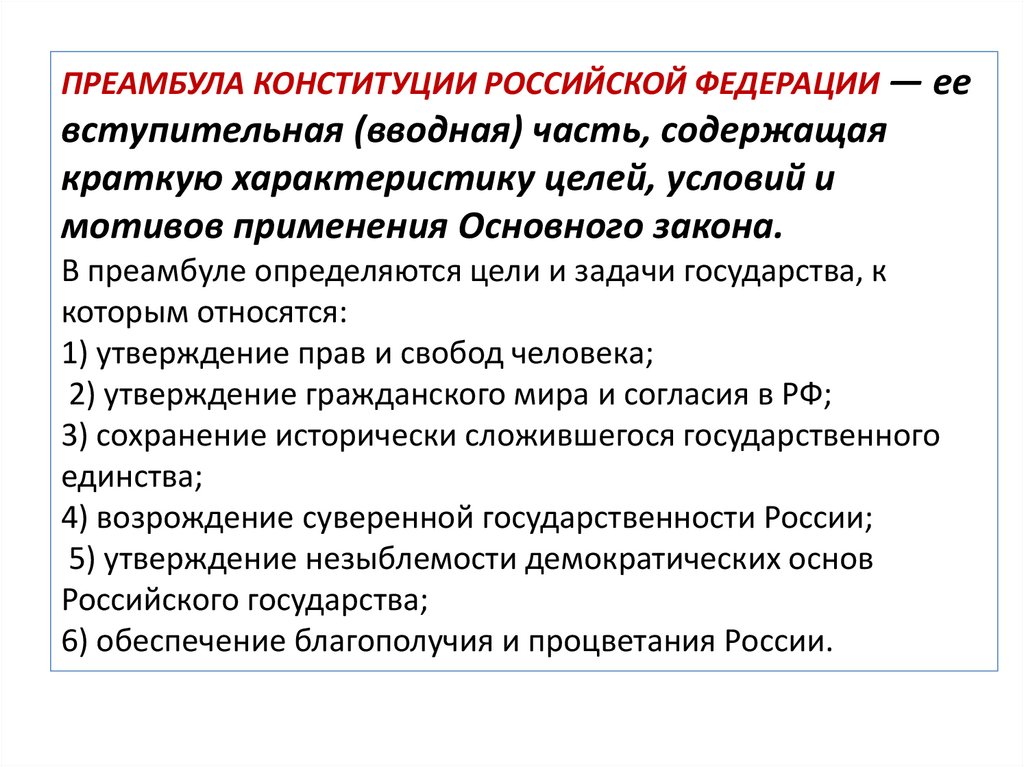 В преамбуле определяются цели и задачи государства, к