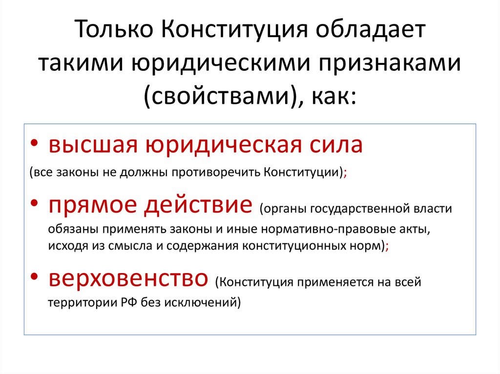 Только Конституция обладаеттакими юридическими признаками