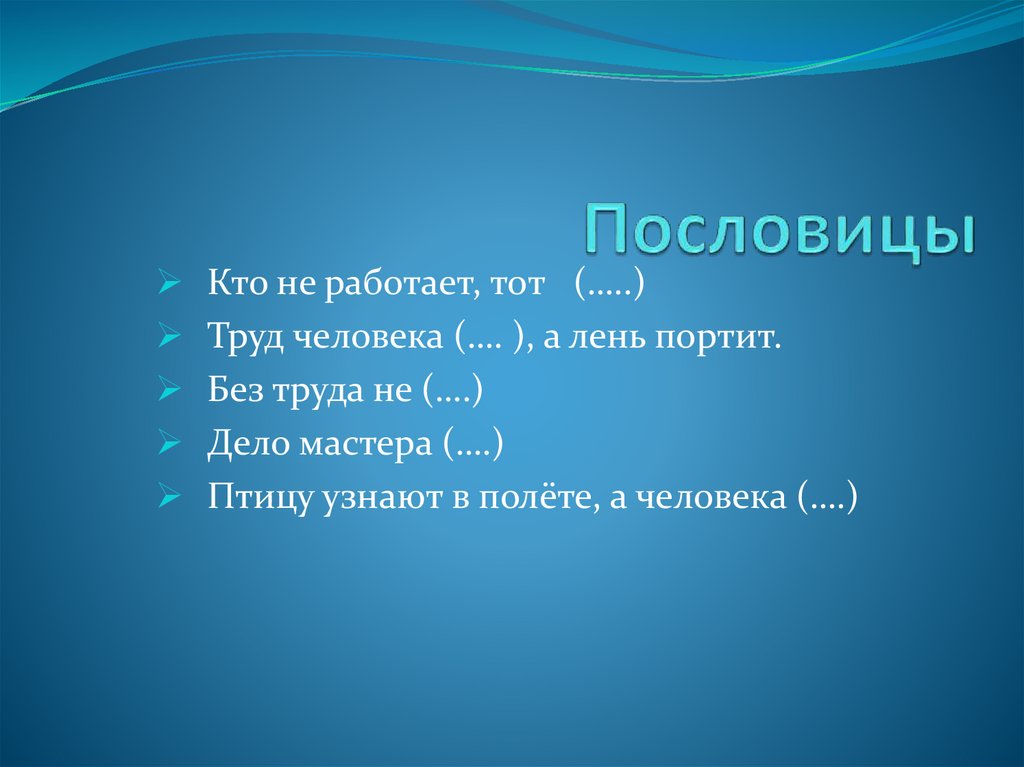 Кто не работает, тот (…..)Труд человека (…. ), а лень портит.