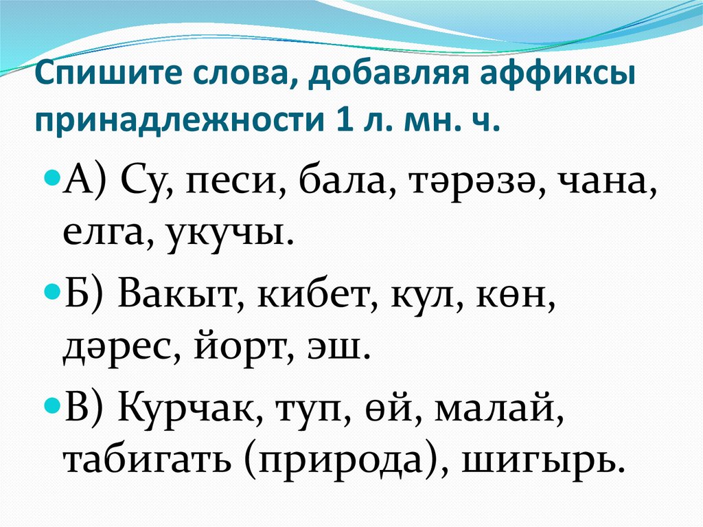 Спишите слова, добавляя аффиксыпринадлежности 1 л. мн. ч.