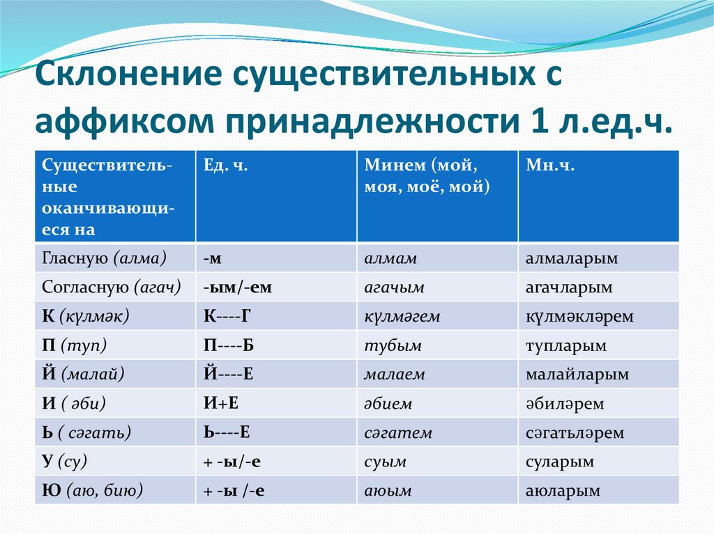 Склонение существительных саффиксом принадлежности 1 л.ед.ч.