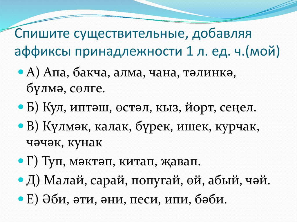 Спишите существительные, добавляяаффиксы принадлежности 1 л. ед. ч.(мой)