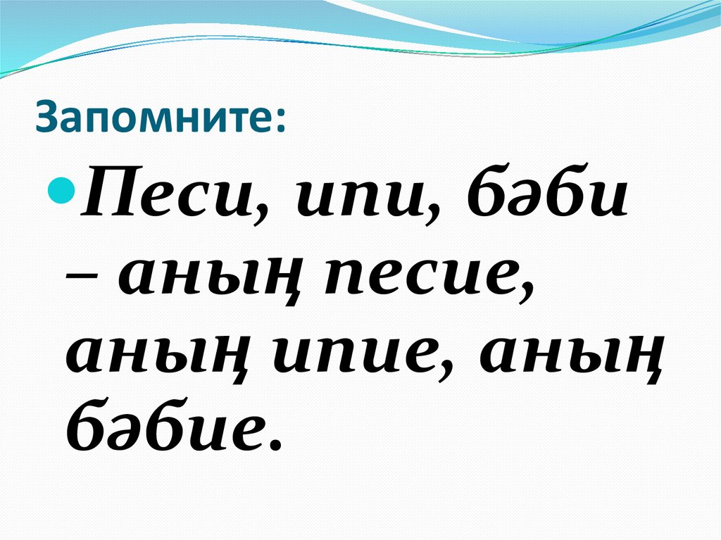 Е) Әби, әти, әни, песи, ипи, бәби.
